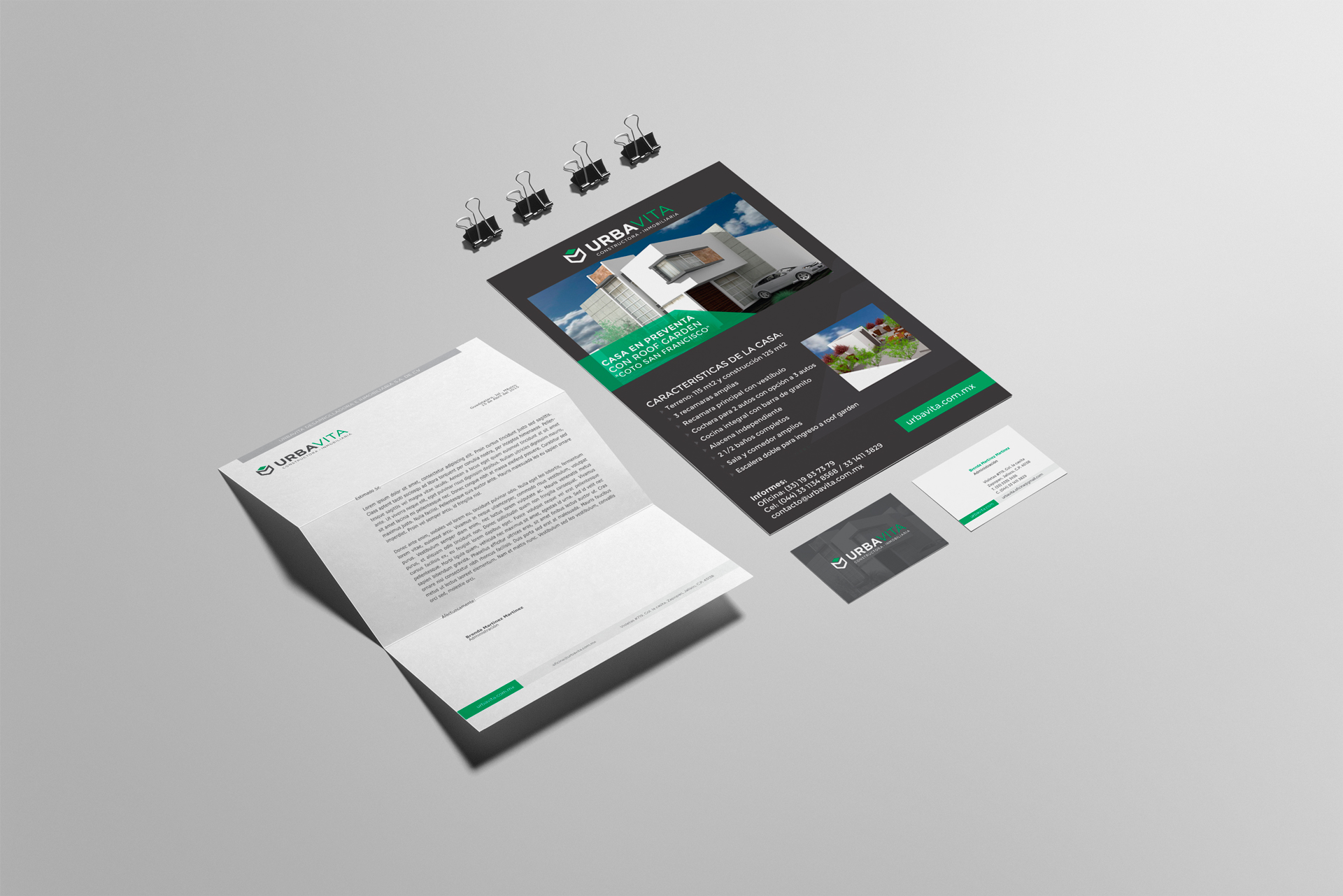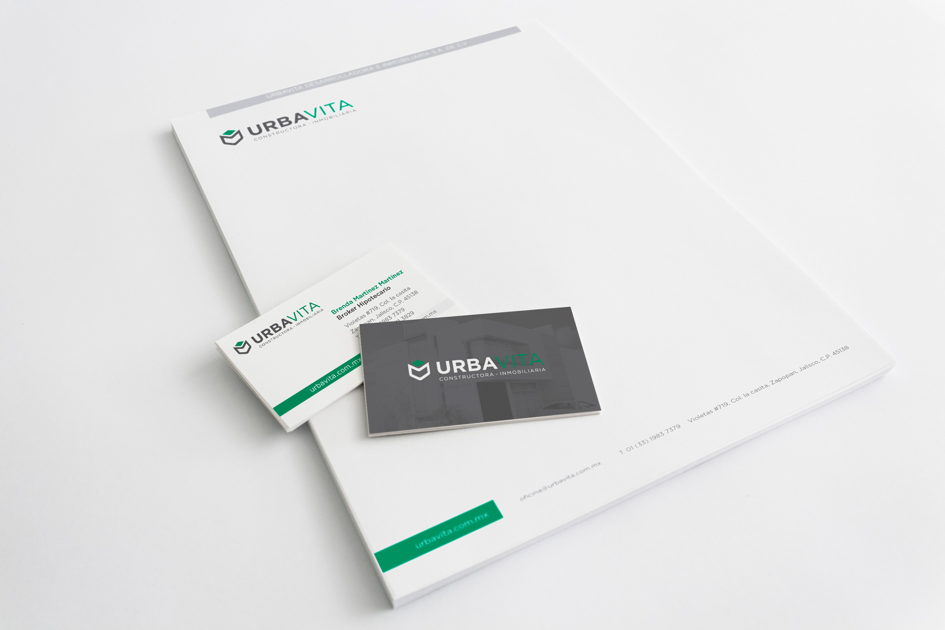 Identidad gráfica que incluye hoja membretada, tarjetas y hoja de venta.